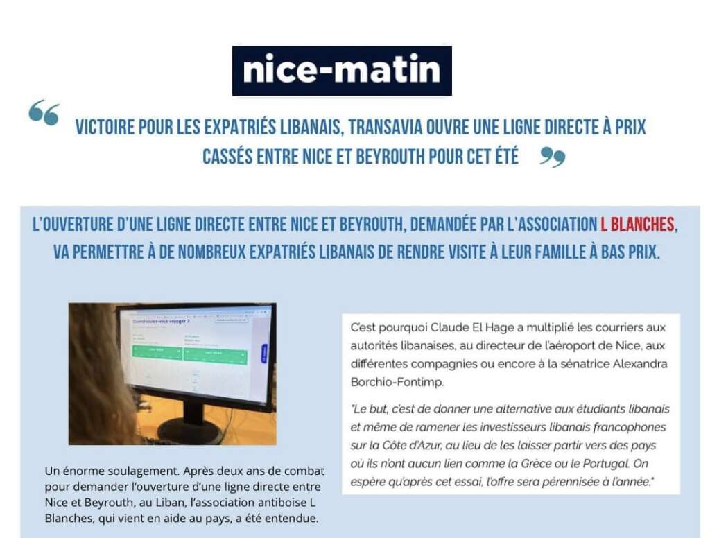 Après deux ans de travail régulier ayant permis de recueillir des données sur le nombre d’expatriés dans les Alpes-Maritimes, des négociations bilatérales entre les deux rives de la Méditerranée nous ont permis d’ouvrir une liaison aérienne low cost entre Nice et Beyrouth, offrant ainsi des tarifs plus abordables aux étudiants et aux familles.