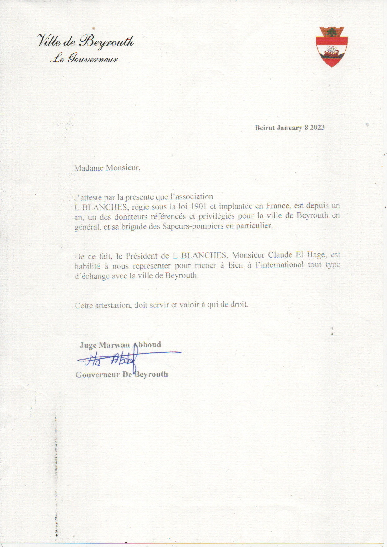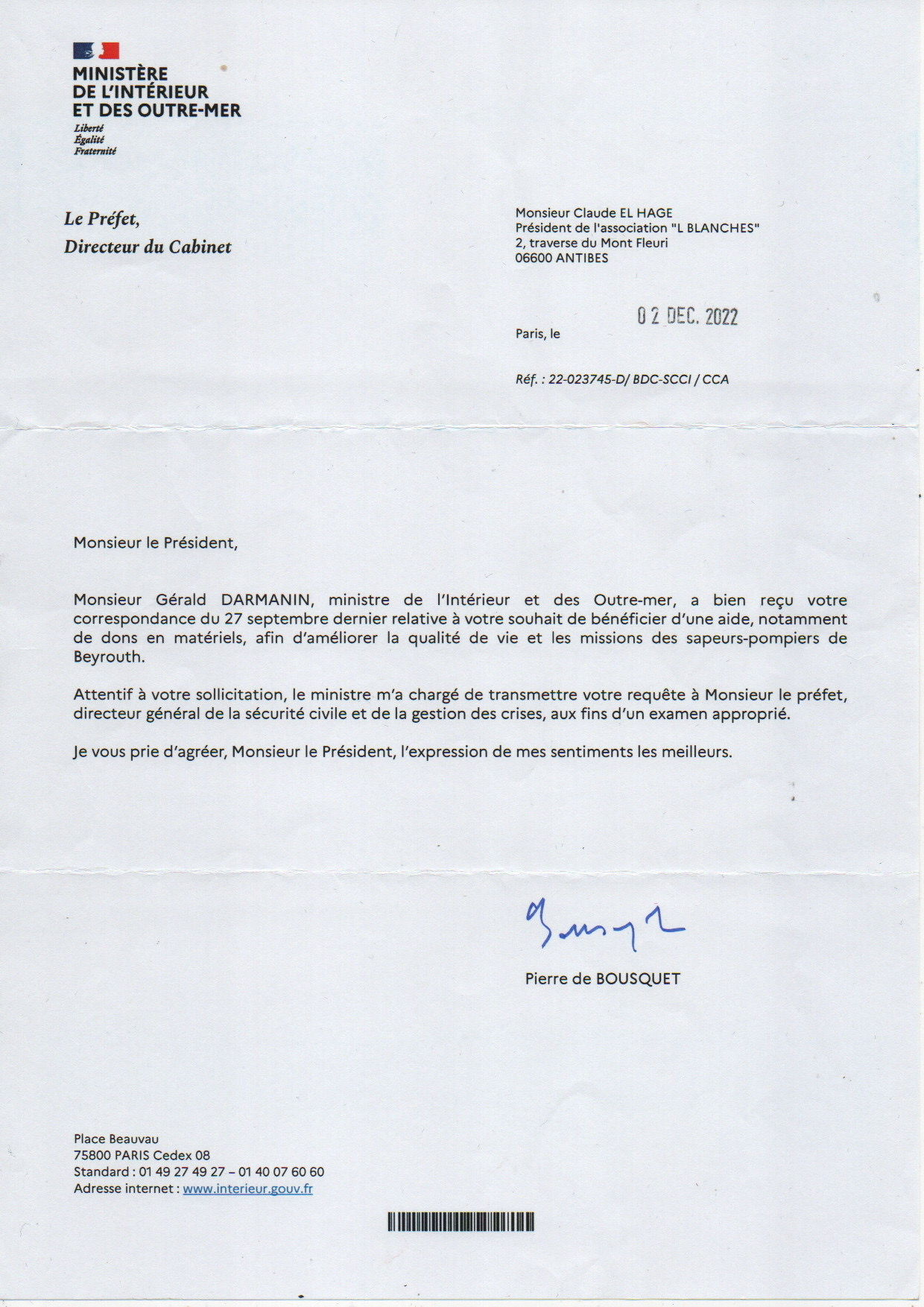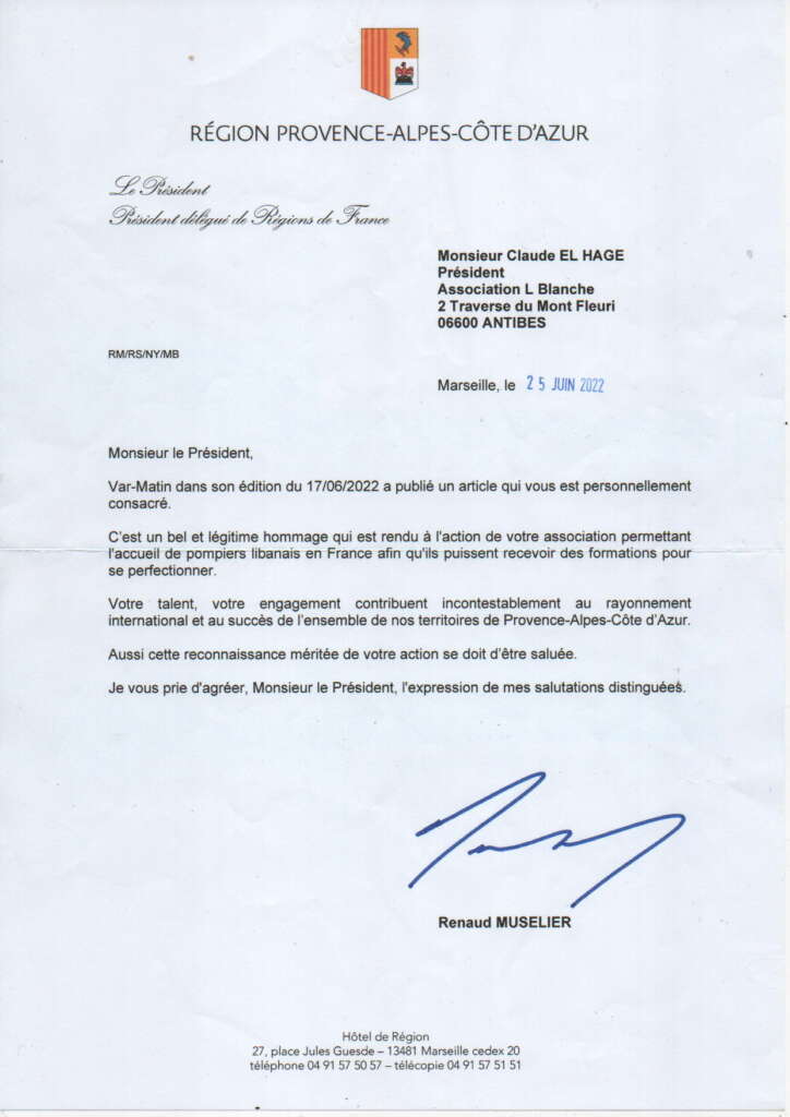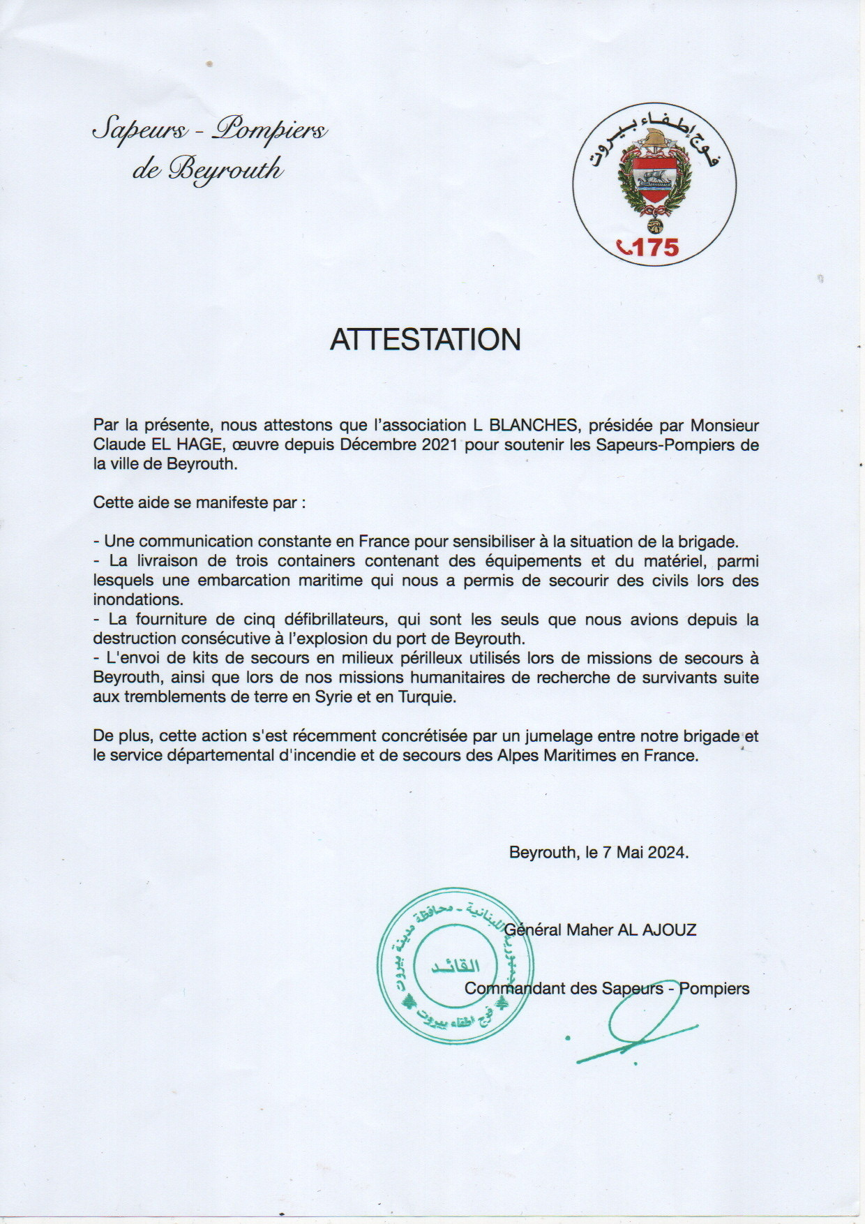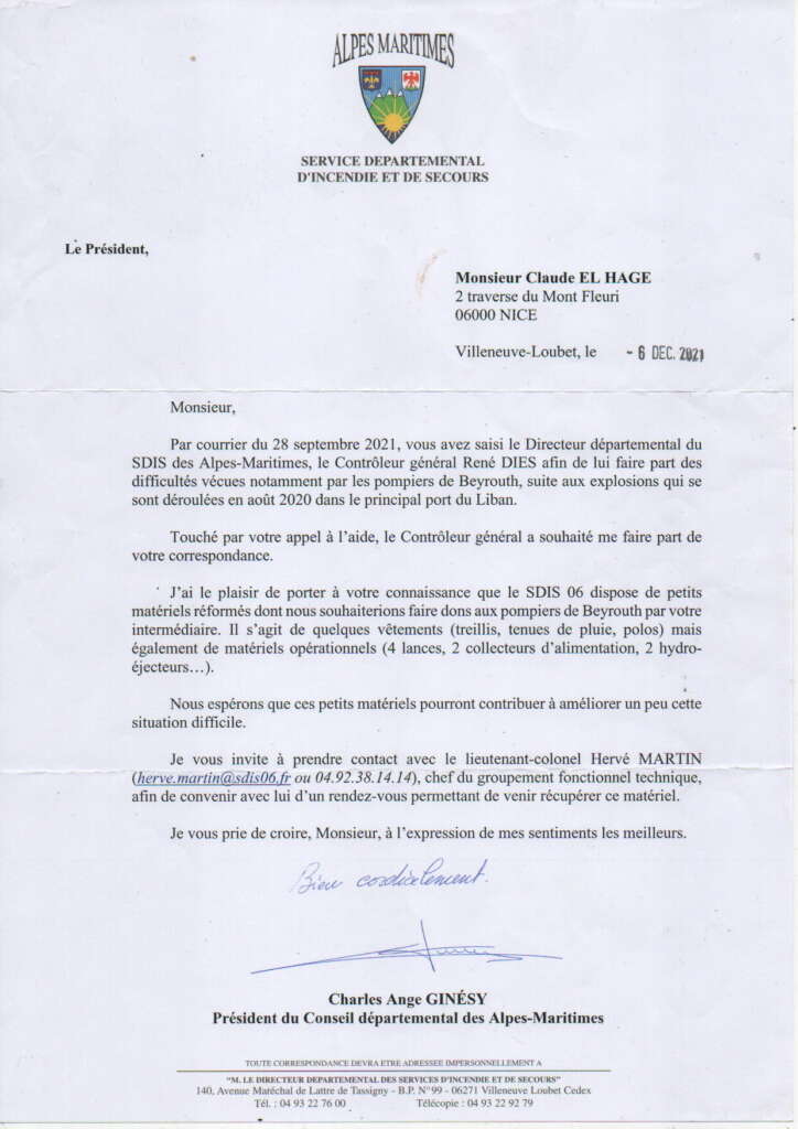 Ces courriers témoignent de notre aide constante, depuis décembre 2021, aux sapeurs-pompiers de Beyrouth, et de notre engagement envers la population libanaise.