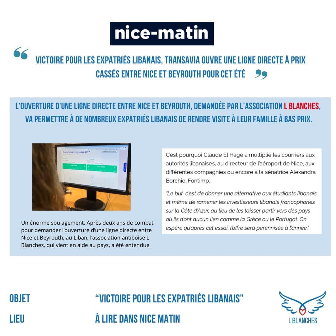 L’ouverture d’une ligne directe entre Nice et Beyrouth, demandée par l’association L Blanches, va permettre à de nombreux expatriés libanais de rendre visite à leur famille à bas prix.